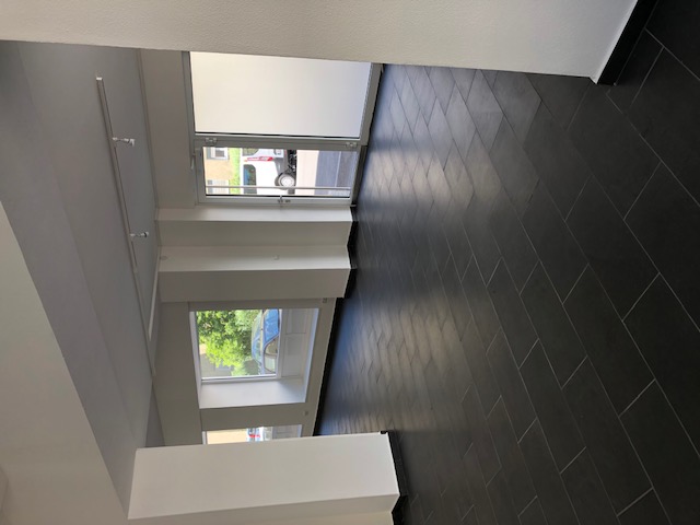 Die Räumlichkeiten können nach Vereinbarung bezogen werden: große, neue Fenster mit VSG-Sicherheitsverglasung – der Boden wurde mit hochwertigen dunkelgrauen Fliesen ausgelegt.