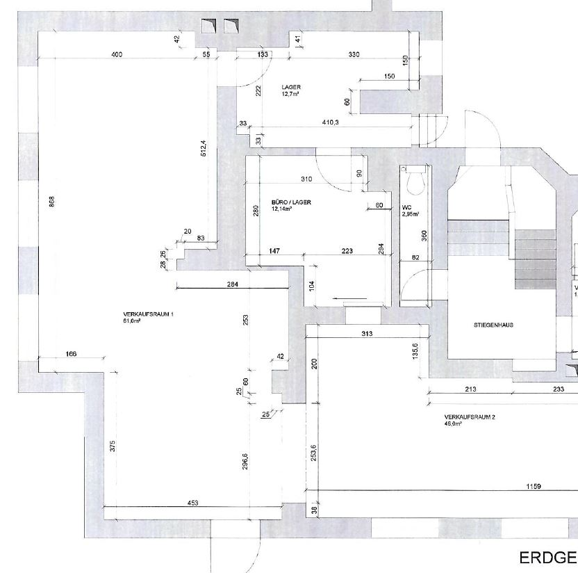 Die Gewerbeeinheit läßt sich auf ca. 139 qm als Büro oder Verkaufsraum nutzen. Die Fläche ist als L-form gestaltet; zur Gewerbeeinheit gehören zwei Verkaufsräume, die ineinanderübergehen sowie ein Raum, der als Lager/Büro/Pausenraum oder als dritter Verkaufsraum genutzt werden kann (mit Spüle). Außerhalb des Ladenlokals/im Treppenhaus befinden sich auch noch ein Gäste WC – im Innenhof, in dem sich auch der zweite Eingang zur Gewerbeeinheit befindet, sind die Garage sowie 2 Pkw-Stellplätze für die Gewerbeeinheit reserviert.