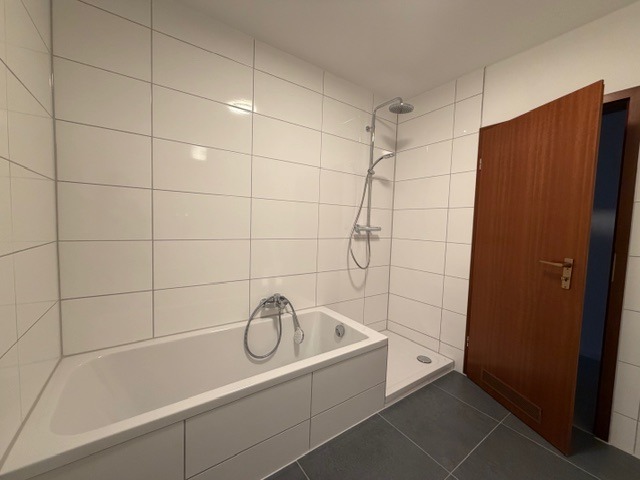Innenliegendes Bad: mit Badewanne, Dusche und Waschmaschinenanschluß sowie WC in weißer Sanitärkeramik mit weißen Wandfliesen