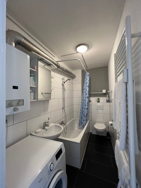 innenliegendes Bad mit Badewanne, Waschbecken, WC sowie Handtuchheizkörper und Waschmaschinenanschluß